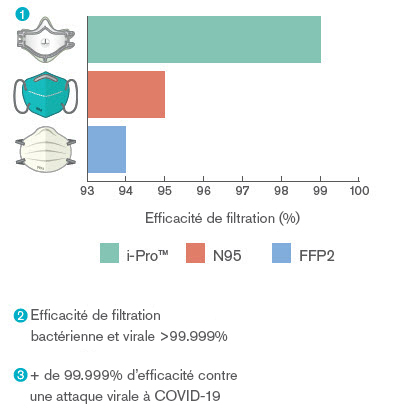 À l’origine, les masques de protection personnelle classiques étaient conçus pour un usage en milieu industriel et ne sont, de fait, pas toujours adaptés aux professionnels de santé. Ceci a fait l’objet de nombreux rapports d’incident. Le masque i-Pro™ a été conçu en gardant les cliniciens à l'esprit. Grâce au média filtrant de nos dispositifs respiratoires, dont l'efficacité bactérienne et virale en environnement clinique a été prouvée, ainsi qu'à la lèvre étanche douce et souple en TPE équipant nos masques, le masque i-Pro™ combine un haut taux de protection avec un ajustement confortable et efficace.